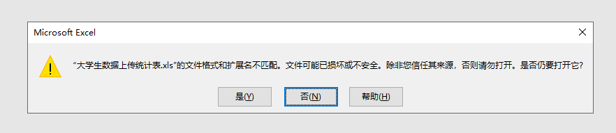 3、打开“大学生数据上传统计表”时若出现如下提示: