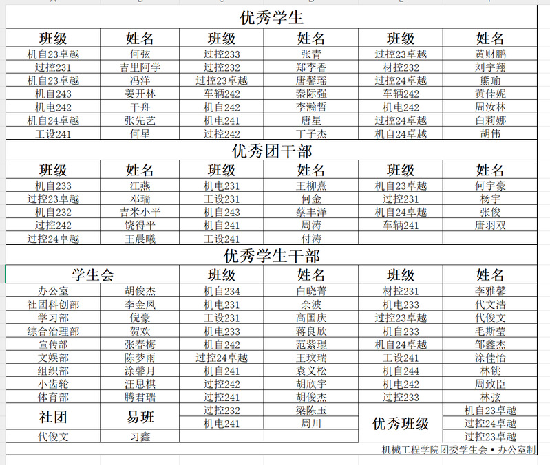 根据机械工程学院团委学生会评优工作条例,经自主申报/部门推荐、资格审查、综合评议等程序,现将2025年9月、10月评优结果公示如下: