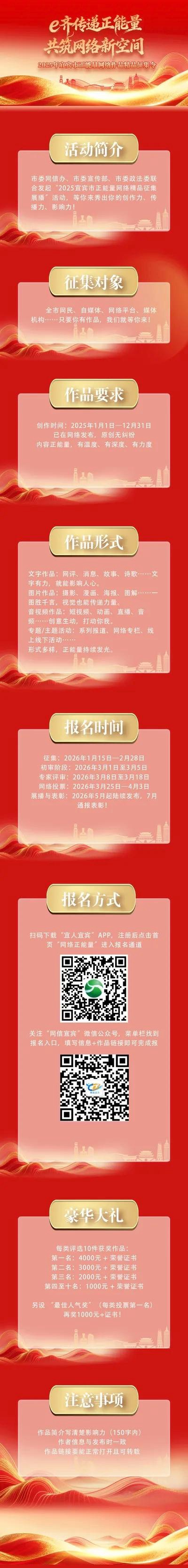 由中共宜宾市委网信办、中共宜宾市委宣传部、中共宜宾市委政法委员会主办的2025年宜宾市网络正能量精品征集展播活动已正式启动。本次活动旨在充分挖掘和评选一批网络正能量文字、网络正能量图片、网络正能量音视频、网络正能量辟谣作品。充分发挥正能量激励人、鼓舞人、引领人的重要作用,以澎湃昂扬的正能量为加快建设现代化区域中心城市贡献宜宾力量。